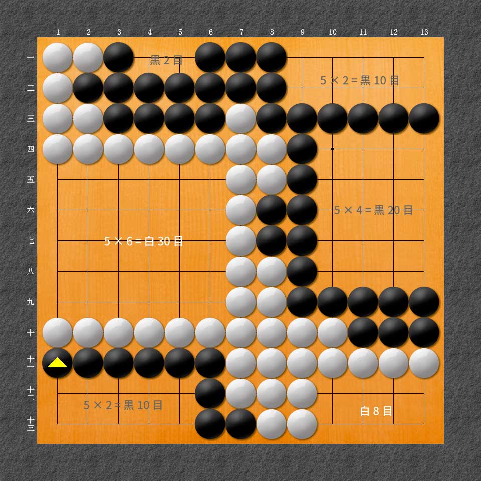 整地のポイントは、掛け算(縦×横)を用いて10目単位(10, 20, 30…)になるように碁石を移動することです。